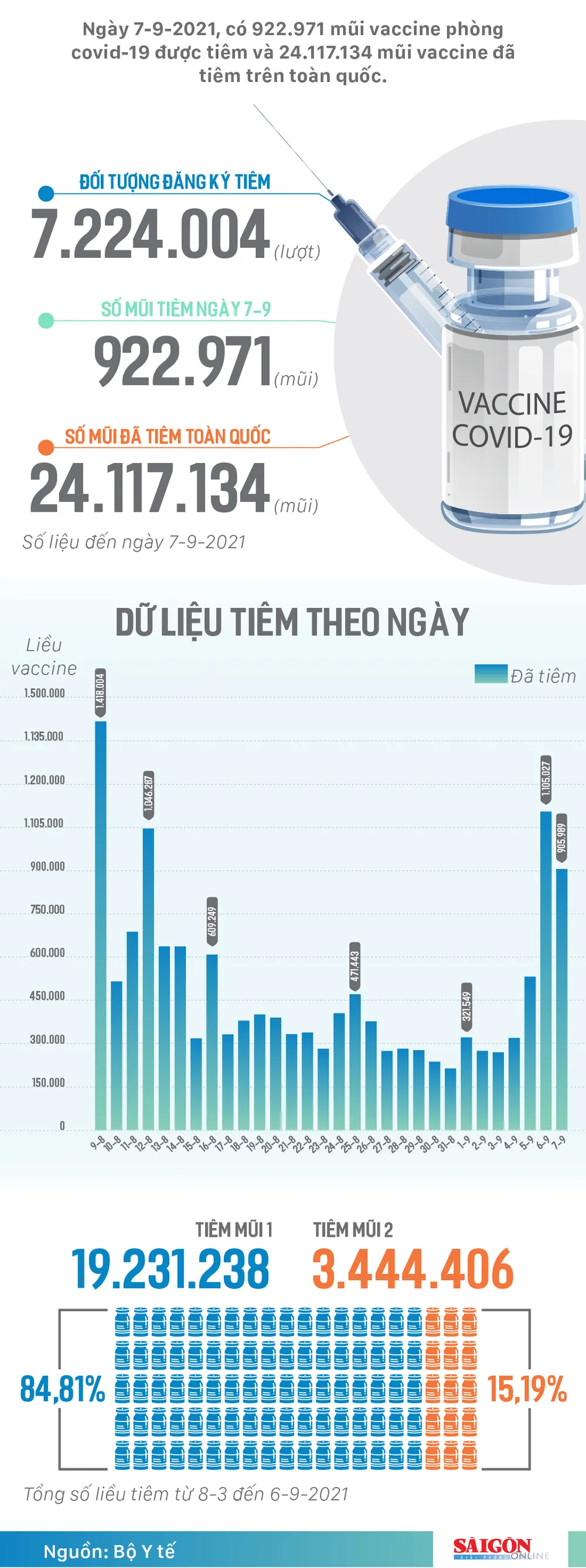 Ngày 7-9-2021, có 922.971 mũi vaccine phòng covid-19 được tiêm và 24.117.134 mũi vaccine đã tiêm trên toàn quốc.