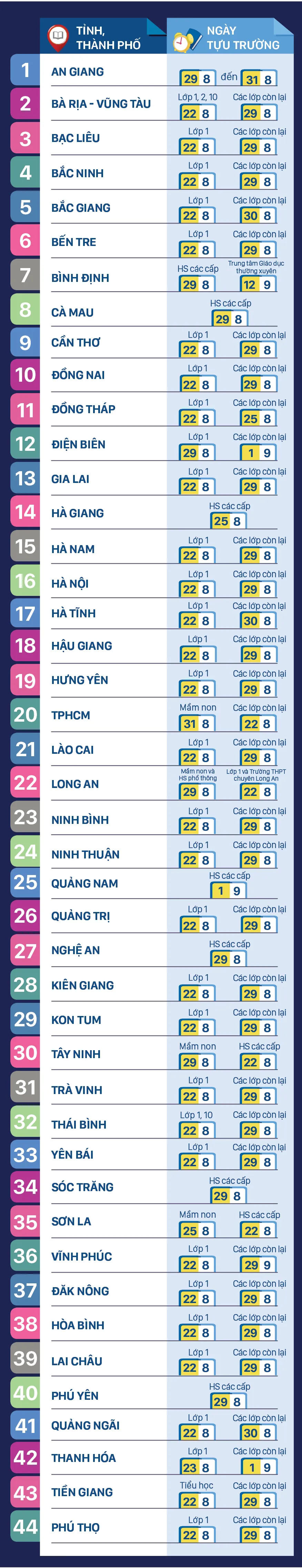 Thời gian khai giảng đồng loạt ở các địa phương là ngày 5-9. Riêng lịch tựu trường, hầu hết tỉnh, thành phố cho học sinh đến trường sớm nhất vào ngày 22-8 (với khối 1) và từ ngày 25-8 đến ngày 5-9 với học sinh các khối còn lại.