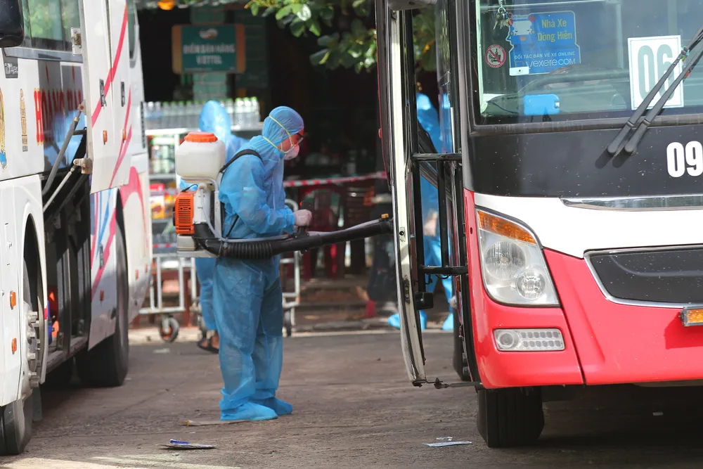 Lực lượng chức năng phun khử khuẩn phương tiện đón người dân