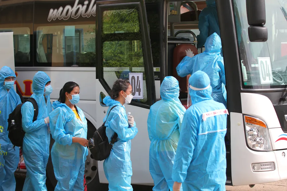 Người dân sau khi làm thủ tục tại ga tàu, lên xe buýt để về các khu cách ly tập trung tại TP Đông Hà