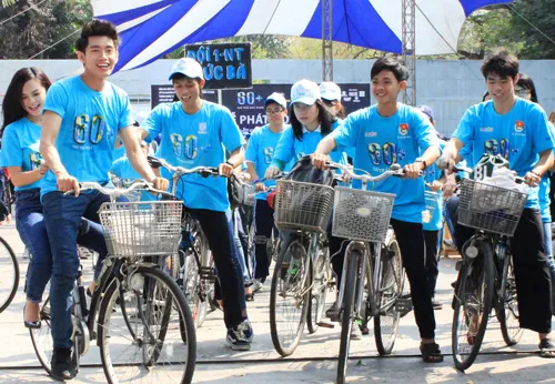 Hai đại sứ chiến dịch (góc trái ảnh) cùng các tình nguyện viên tại lễ ra quân đạp xe hưởng ứng “Giờ trái đất xanh 2015”.