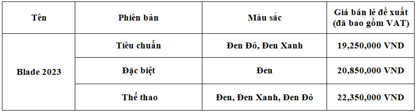 Honda Blade phiên bản 2023 sẽ được chính thức bán ra thị trường từ ngày 12 tháng 04 năm 2023 thông qua Hệ thống Cửa hàng Bán xe và Dịch vụ do Honda Ủy nhiệm (HEAD) trên toàn quốc với chế độ bảo hành 3 năm hoặc 30.000 km và giá bán lẻ đề xuất như sau: