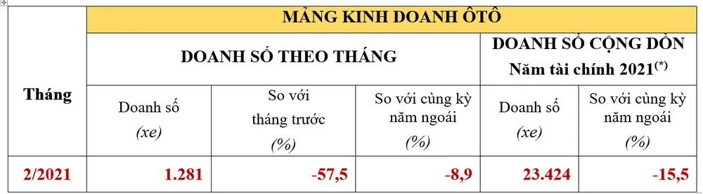 Đối với mảng ô tô, có 1.281 xe mới được bàn giao tới khách hàng,giảm 57,5% so với tháng trước, giảm 8,9% so với cùng kỳ năm ngoái. Cụ thể: