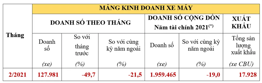 Ở mảng xe máy, tháng 2-2021 Honda bán được 127.981 xe, giảm 49,7% so với tháng trước và giảm 21,5% so với cùng kỳ năm ngoái, cụ thể: