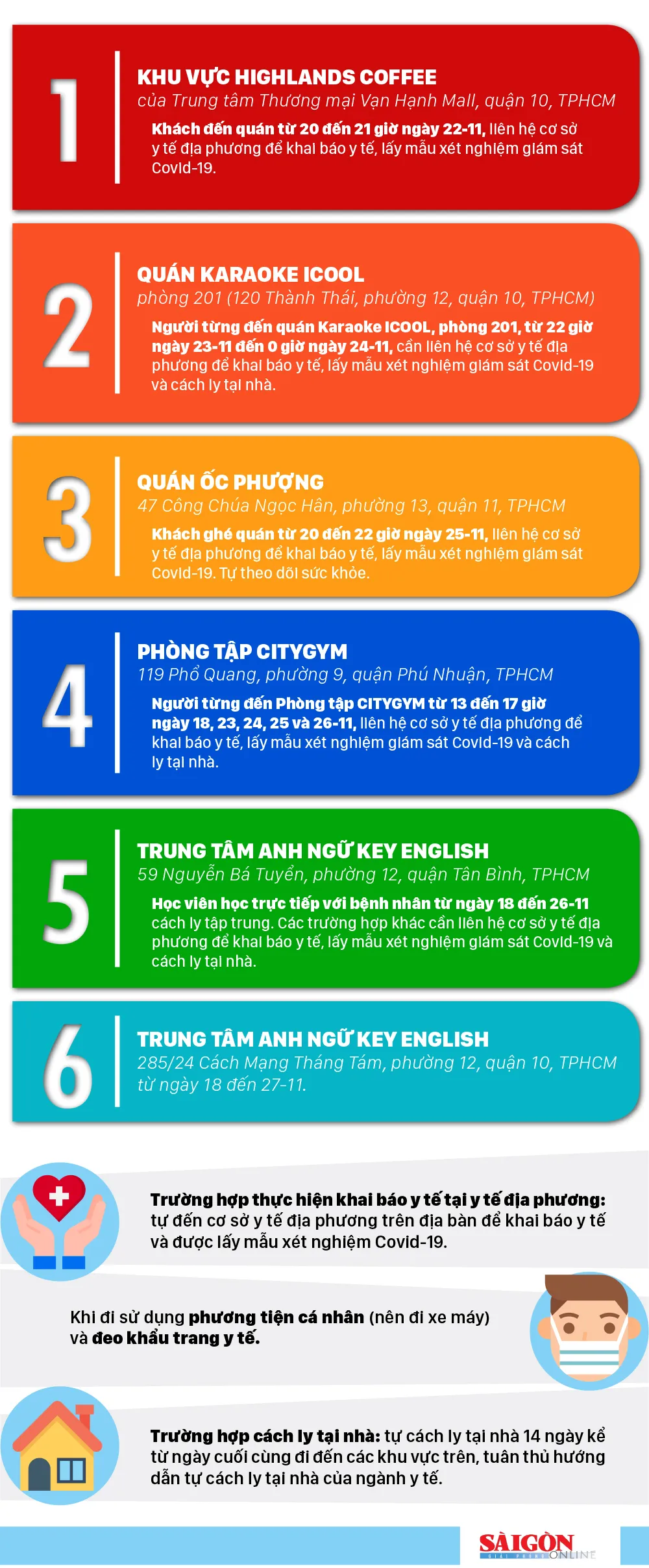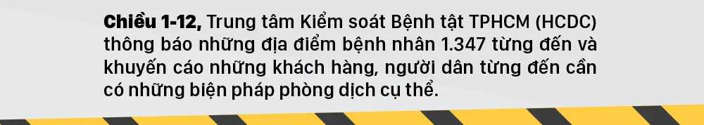 Chiều 1-12, Trung tâm Kiểm soát Bệnh tật TPHCM (HCDC) thông báo những địa điểm bệnh nhân 1.347 từng đến và khuyến cáo những khách hàng, người dân từng đến cần có những biện pháp phòng dịch cụ thể.