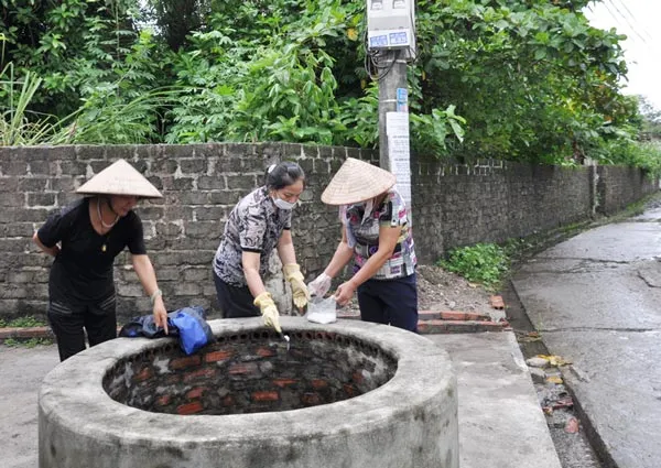 Người dân dùng hóa chất khử khuẩn nguồn nước giếng để bảo đảm an toàn