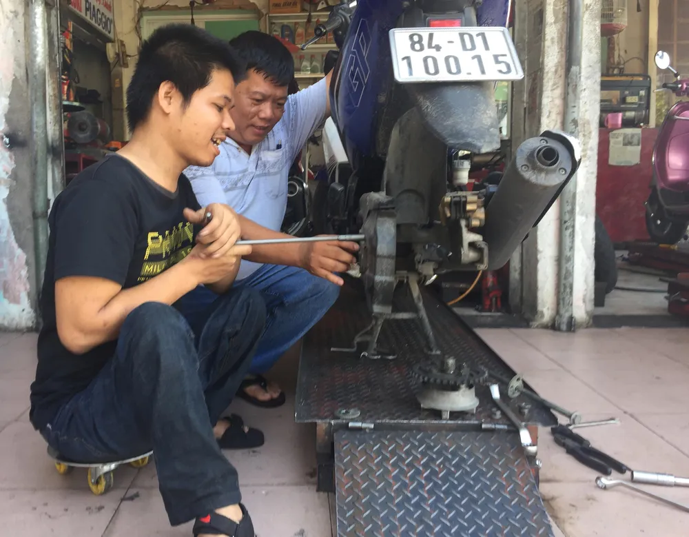 Một lần đến sửa xe tại tiệm Tân Phúc Mập gần chân cầu Chánh Hưng (quận 8, TPHCM), tôi ngạc nhiên khi thấy những người thợ sửa xe đa phần là người khuyết tật. Có người cụt chân, có người thiếu cánh tay nhưng tất cả đều làm việc rất chăm chỉ và thao tác nhanh nhẹn. Ngồi trên chiếc xe tự chế bằng miếng ván có 4 bánh xe, Lê Hoàng Hiệp (33 tuổi, quê Đồng Tháp) mở từng con ốc vít xe với đôi tay thoăn thoắt.