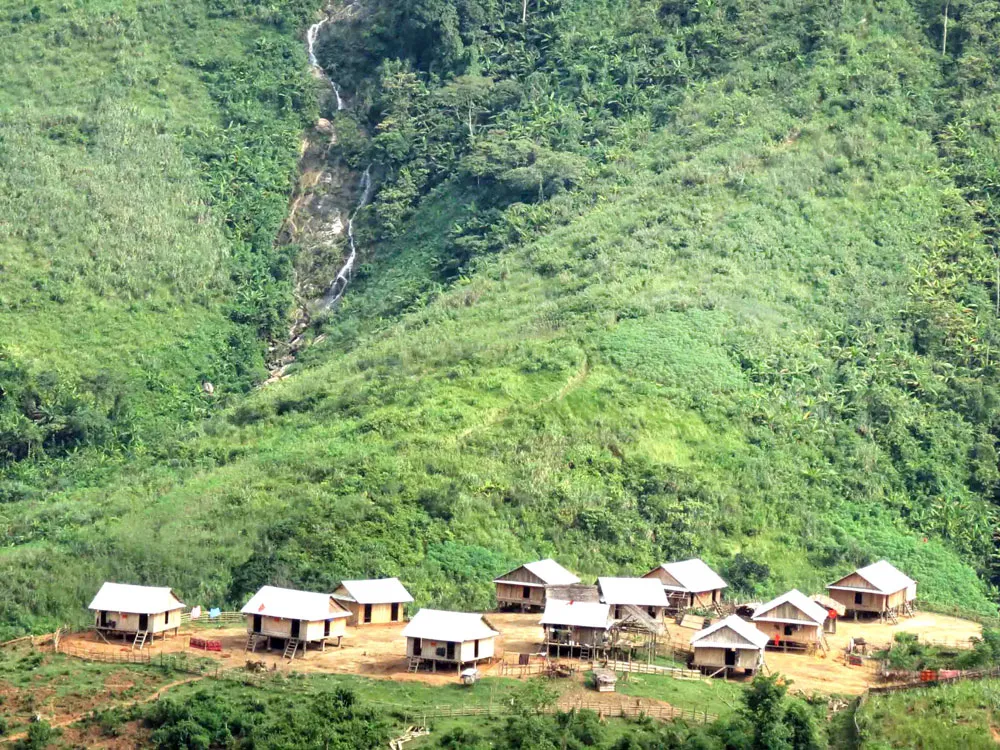 Muốn đến Khe Nước Rụng, phải có người bản địa dẫn đường. Thức dậy từ khi tiếng gà rừng vừa gáy sớm, Hồ Phàm đã cùng một số thanh niên làm lễ xin thần rừng vào chốn sâu thẳm. Tôi lon ton đi theo như đứa trẻ mới lớn lần đầu được chạm đất thiêng của người anh em vùng cao. Một con đường nhỏ cuối bản đủ bàn chân người men theo lưng vách núi, dưới kia là tiếng nước suối chảy réo sâu vực thẳm. Khi trời hửng sáng, đủ tiếng chim hót vang cả núi rừng, có mấy đàn voọc núi đá chuyền cành, xa xa có tiếng loài vượn Siki hót đánh dấu lãnh thổ. Đi từng đoạn, Hồ Phàm dừng lại trước các dấu chân rất mới của con nai, con mang hay nhiều dấu chân lợn rừng cày đất từ mấy hôm trước.