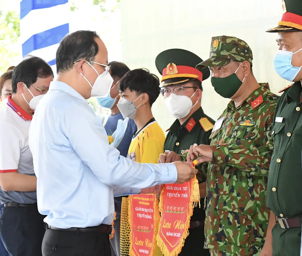 Phó Bí thư Thành ủy TPHCM Nguyễn Hồ Hải tặng cờ lưu niệm cho lực lượng tổ chức, tham gia giải đua thuyền. Ảnh: VIỆT DŨNG