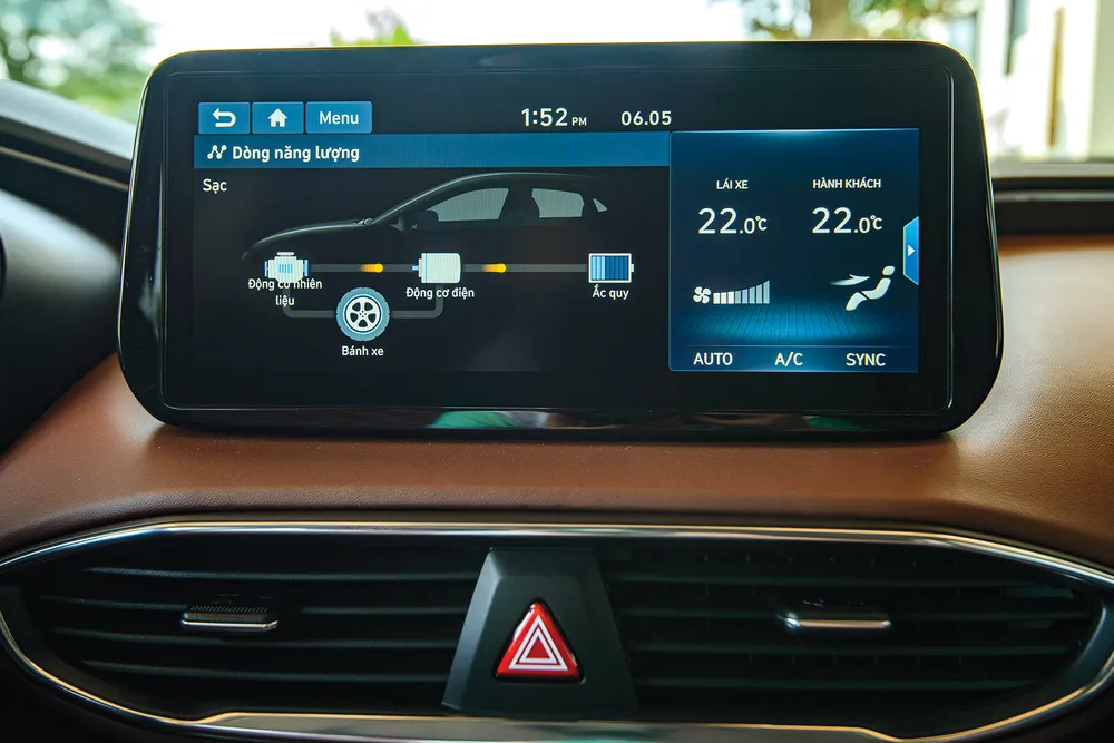 Hyundai Santa Fe Hybrid sử dụng hệ thống Full Hybrid, hay còn gọi là Parallel-Hybrid với động cơ điện và động cơ đốt trong có thể hoạt động riêng lẻ hoặc kết hợp với nhau tùy từng điều kiện vận hành. Pin của động cơ điện có thể tự sạc bằng năng lượng cung cấp từ động cơ đốt trong. Trên mẫu SUV của Hyundai, đảm nhiệm cho việc vận hành là động cơ xăng SmartStream 1,6L Turbo cho công suất 180 mã lực tại 5.500 vòng/phút cùng Momen xoắn cực đại 265Nm tại 1.500 ~ 4.500 vòng/phút.