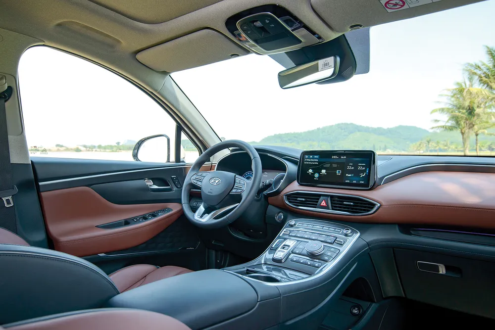 Thiết kế và trang bị nội thất trên Santa Fe Hybrid ấn tượng với vật liệu da mềm được sử dụng trên xe có chất lượng hoàn thiện cao. Hàng ghế thứ hai có thế gập và trượt chỉ bằng một nút bấm. Điều này giúp hành khách ra vào hàng ghế cuối thuận tiện hơn. Hàng ghế thứ 3 gập hết xuống cho không gian cốp xe rộng rãi. Ở hàng ghế cuối cũng có cửa gió điều hòa riêng biệt…