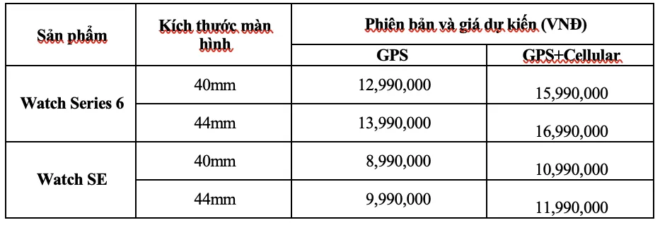 Từ những thông tin được công bố chính thức tại sự kiện Apple 2020 diễn ra vào tối ngày 15-9, các sản phẩm mới của Apple vừa ra mắt bao gồm Apple Watch SE, Apple Watch Series 6, iPad 8th Gen và iPad Air 4 sẽ chính thức bán ra tại Việt Nam khoảng thời gian từ giữa đến cuối tháng 10 với giá bán dự kiến từ 8,99 triệu đồng.