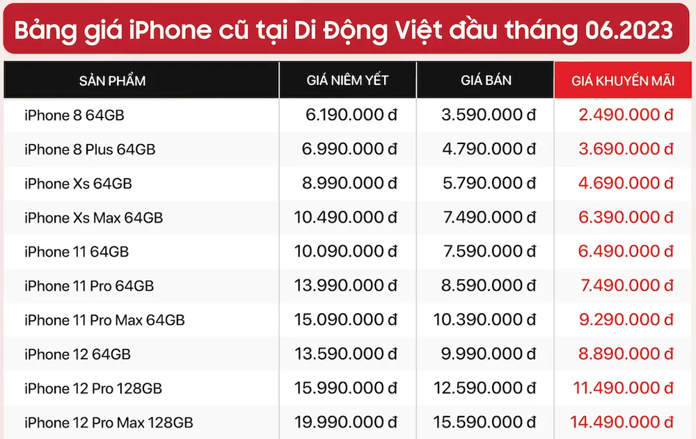 So với đầu tháng 5, có model đã giảm thêm đến 500 ngàn đồng, như iPhone 8, iPhone Xs, iPhone 11 Pro… Các sản phẩm iPhone cũ tại Di Động Việt đều có nguồn gốc rõ ràng, chất lượng tốt và ngoại hình đẹp như máy mới… và để người dùng thêm an tâm, hệ thống còn áp dụng các chính sách bảo hành như dùng thử 7 ngày miễn phí, bảo hành 1 đổi 1 và rơi vỡ trong 12 tháng và bảo hành pin trọn đời…