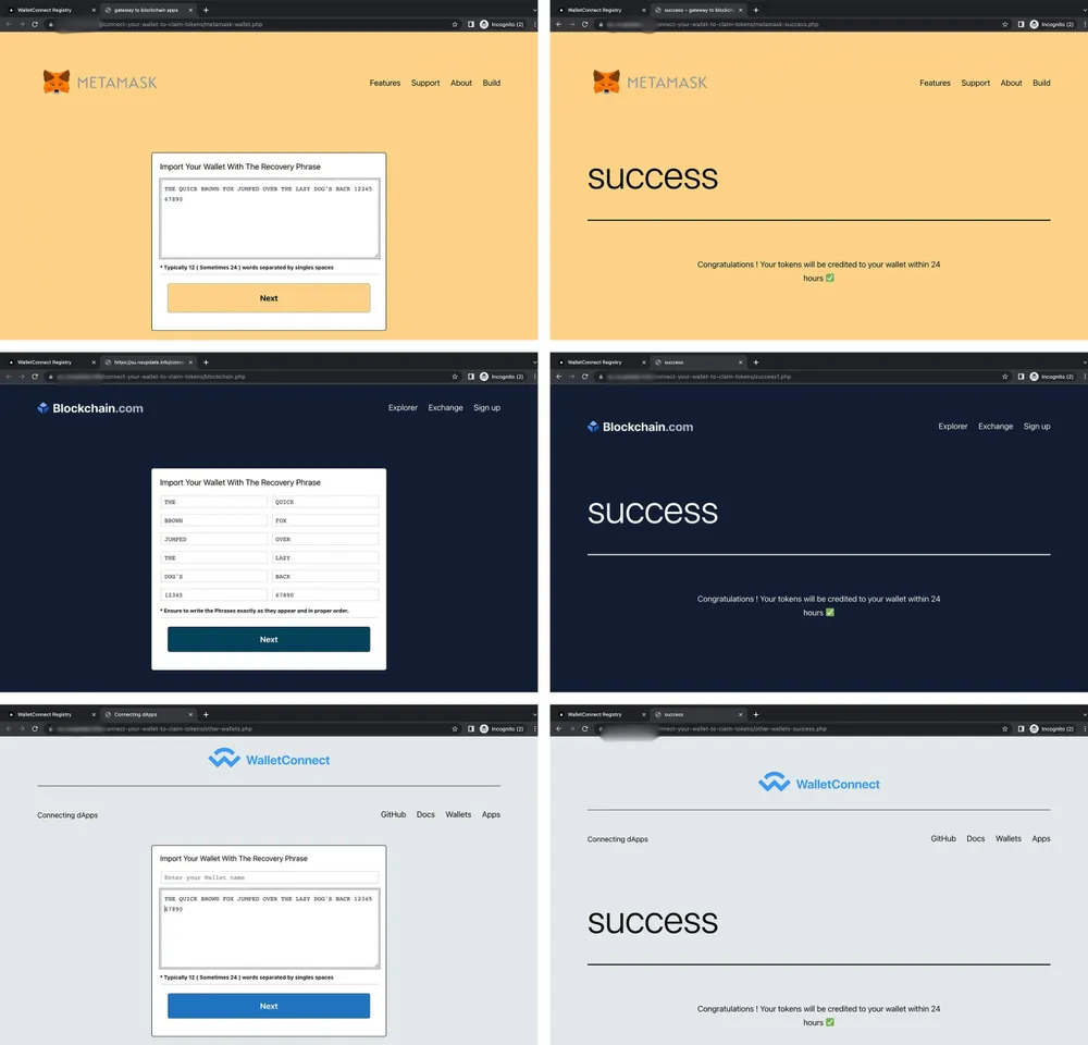Bây giờ là phần thú vị nhất: để nhận được khoản tiền như mong muốn, người dùng phải nhập seed phrase (chuỗi từ khóa dùng để truy cập ví tiền mã hóa). Ngay sau khi nạn nhân điền đầy đủ thông tin và nhấp vào nút "Tiếp theo", một thông báo sẽ xuất hiện trên màn hình cho biết mọi thứ đã thành công và người may mắn sẽ nhận được tiền mã hóa trong vòng 24 giờ.