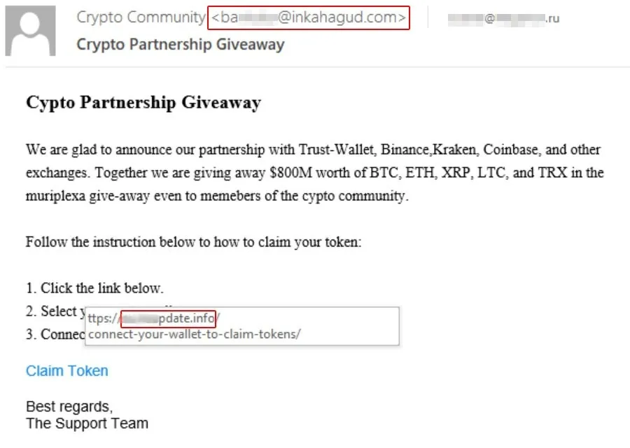 Như thường lệ, tất cả bắt đầu bằng một e-mail. Những kẻ đứng sau kế hoạch này đã lấy mồi nhử là lời đề nghị tham gia vào chương trình tặng quà hấp dẫn về tiền mã hóa: Bitcoin (BTC), Ethereum (ETH), Litecoin (LTC), Tron (TRX) hoặc Ripple (XRP).