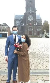 Dẫu vậy, cô dâu đã tự trang điểm và diện đầm đẹp vẫn chạnh lòng khi đọc tấm biển “Bắt buộc đeo khẩu trang” trên cửa tòa thị chính thành phố Schiedam. Lễ kết hôn thời dịch giã vô cùng đơn giản: hai vợ chồng và ba mẹ chồng ở vai trò người làm chứng, một người chủ trì lễ của tòa thị chính.