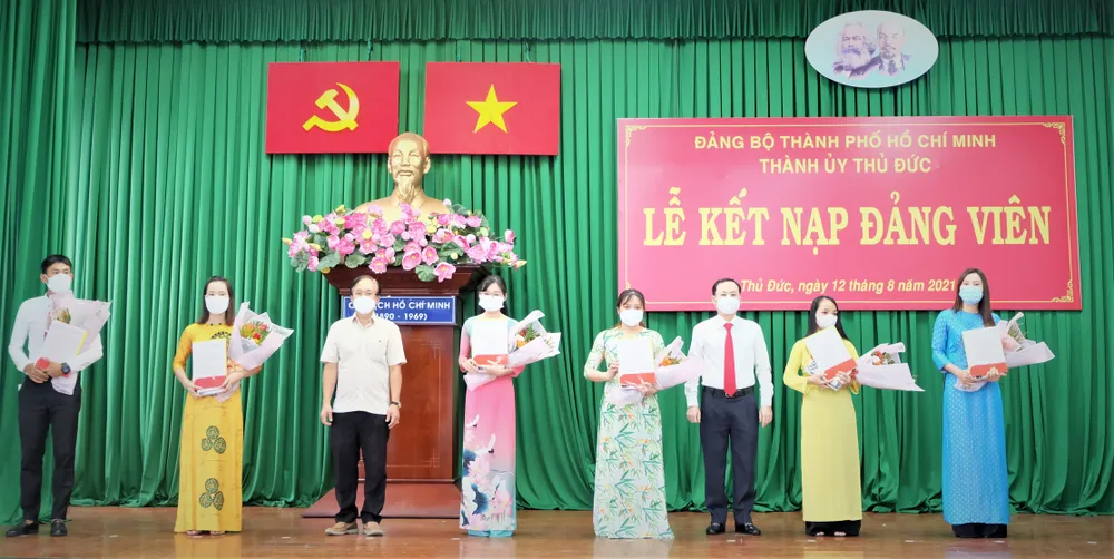 Bí thư Thành ủy TP Thủ Đức Nguyễn Văn Hiếu chúc mừng các đồng chí được kết nạp đảng hôm nay; đồng thời mong các đồng chí luôn giữ vững phẩm chất đạo đức, năng lực chuyên môn để hoàn thành xuất sắc mọi nhiệm vụ, trước mắt là nhiệm vụ phòng, chống dịch, lâu dài là nhiệm vụ chuyên môn tại cơ quan, đơn vị.