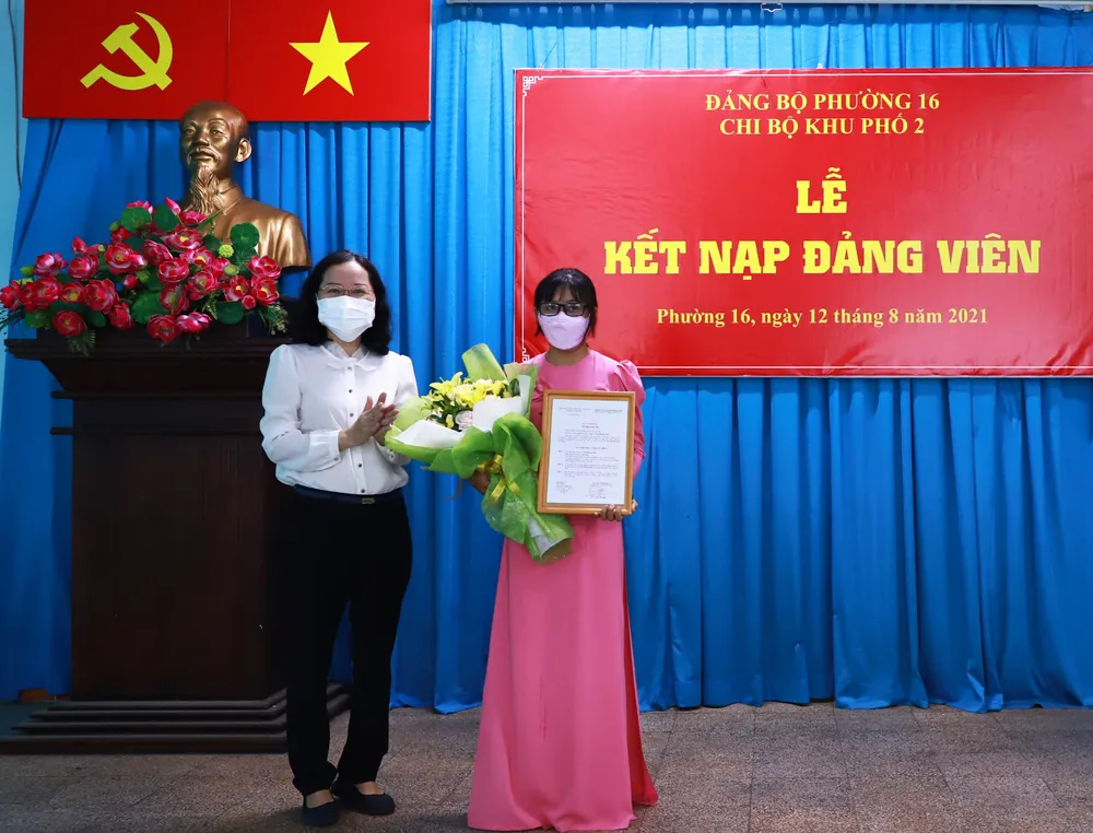 Sáng 12-8, Chi bộ khu phố 2, phường 16 (quận 4) tổ chức Lễ kết nạp đảng viên cho quần chúng ưu tú Võ Thị Phương Mai, Phó Chủ tịch Hội Liên hiệp Phụ nữ phường 16. Tham dự có đồng chí Thái Thị Bích Liên, Bí thư Quận ủy quận 4.