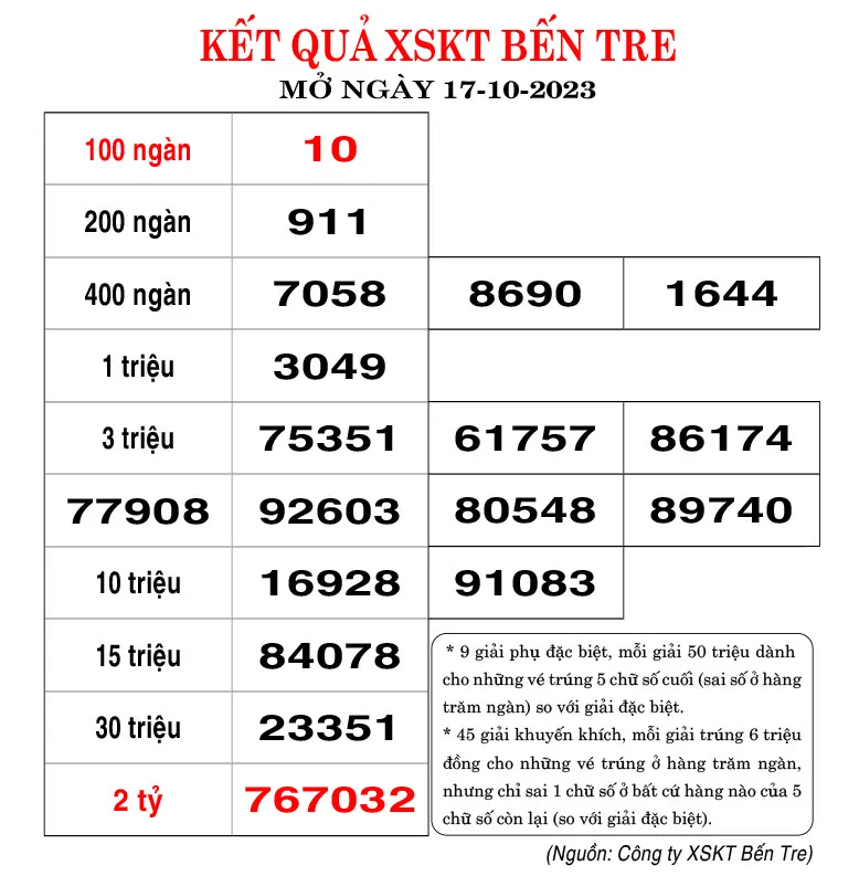 Kết quả XSKT tỉnh Bến Tre, loại vé 10.000đ, mở thưởng ngày 17-10-2023