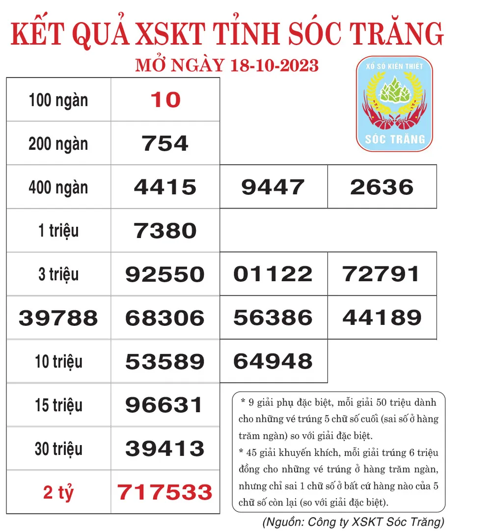 Kết quả Xổ số đài Sóc Trăng ngày 18-10-2023