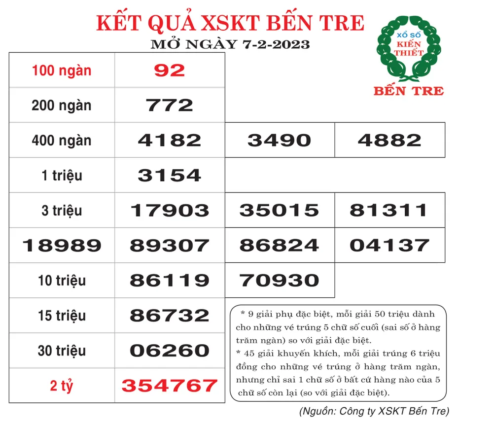 * Tổng số tiền trả thưởng các Giải Đặc biệt từ đầu năm đến ngày 03-02-2023 là: 132.000.000.000đ.