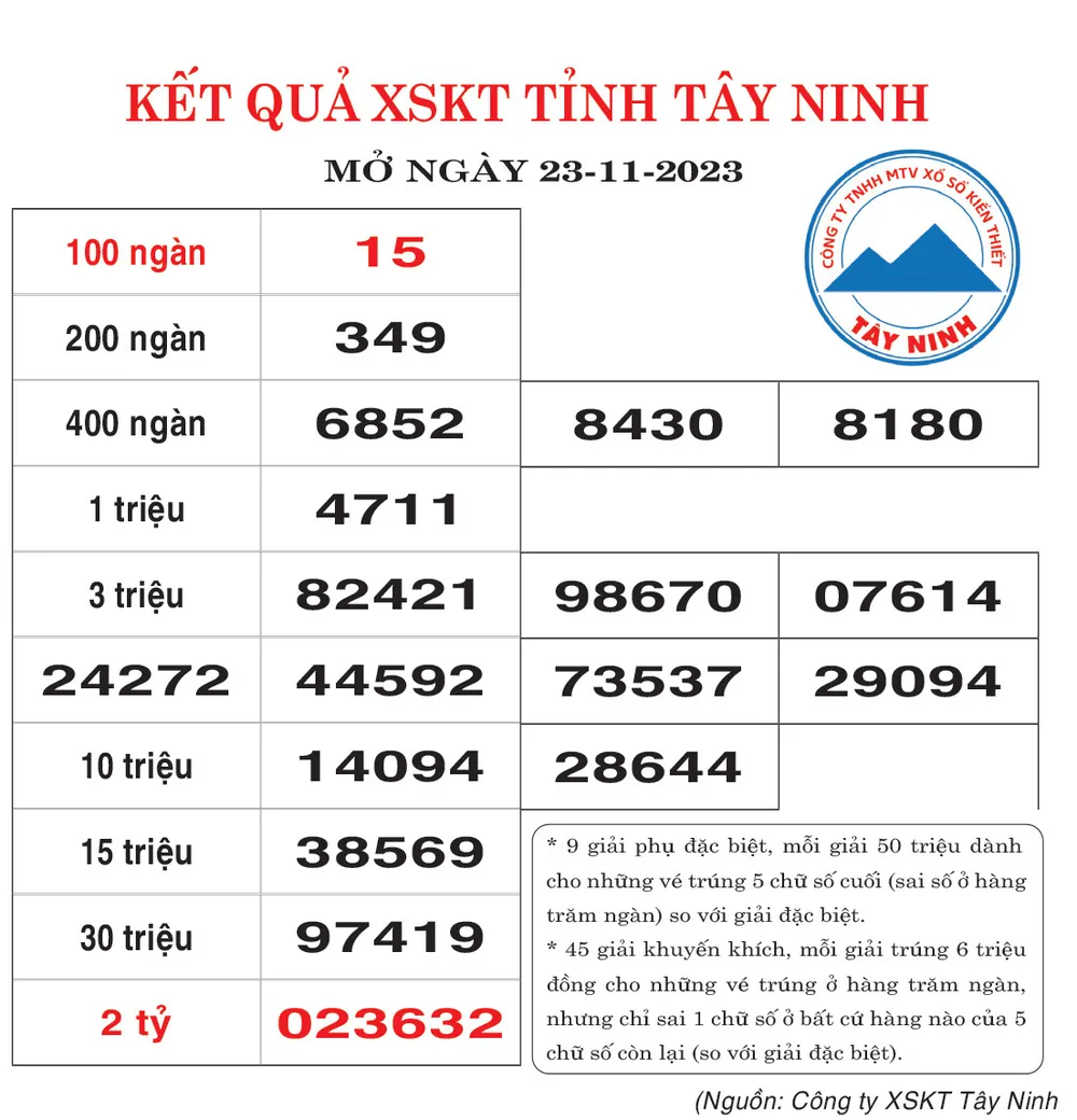 Kết quả mở thưởng vé số Bình Thuận ngày 16/11/2023, ký hiệu 11K3: + Khách hàng tại Tỉnh Tiền Giang đã trúng giải đặc biệt, tổng giá trị giải thưởng: 24 tỷ đồng. + Khách hàng tại Tỉnh Tiền Giang giải phụ đặc biệt, tổng giá trị giải thưởng: 5,4 tỷ đồng. + Khách hàng tại Tỉnh Bến Tre đã trúng giải nhất, tổng giá trị giải thưởng: 3,6 tỷđồng. - Số tiền Công ty chi trả thưởng cho khách hàng trong kỳ thanh toán ngày 16/11/2023 là: 53.968 tỷ đồng. - Lũy kế số tiền Công ty đã chi trả thưởng cho khách hàng đến ngày 16/11/2023 là: 2.712.297.400.000 tỷ đồng. |