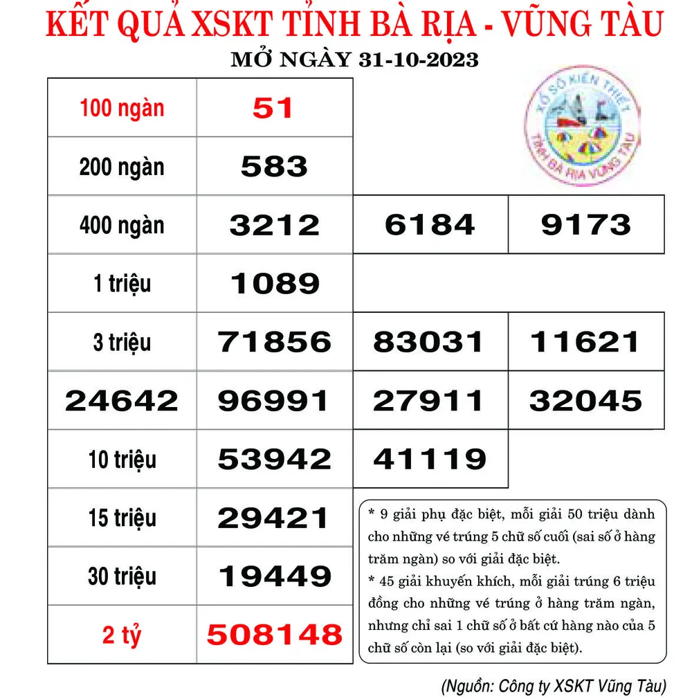* Tổng số tiền trả thưởng các giải Đặc biệt từ đầu năm đến ngày 27-10-2023 là: 1.044.000.000.000 đồng (Một ngàn không trăm bốn mươi bốn tỷ đồng).