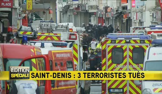 Les Echos cho biết cảnh sát chống khủng bố với trực thăng yểm trợ tấn công một căn hộ ở Saint-Denis, ngoại ô Paris, trong đó các nghi phạm cố thủ. Những tiếng súng đầu tiên được nghe thấy khoảng 4 giờ 30 sáng (10 giờ 30 giờ VN). Chủ mưu các cuộc tấn công Paris, Abdelhamid Abaaoud, là mục tiêu của chiến dịch ở Saint-Denis.