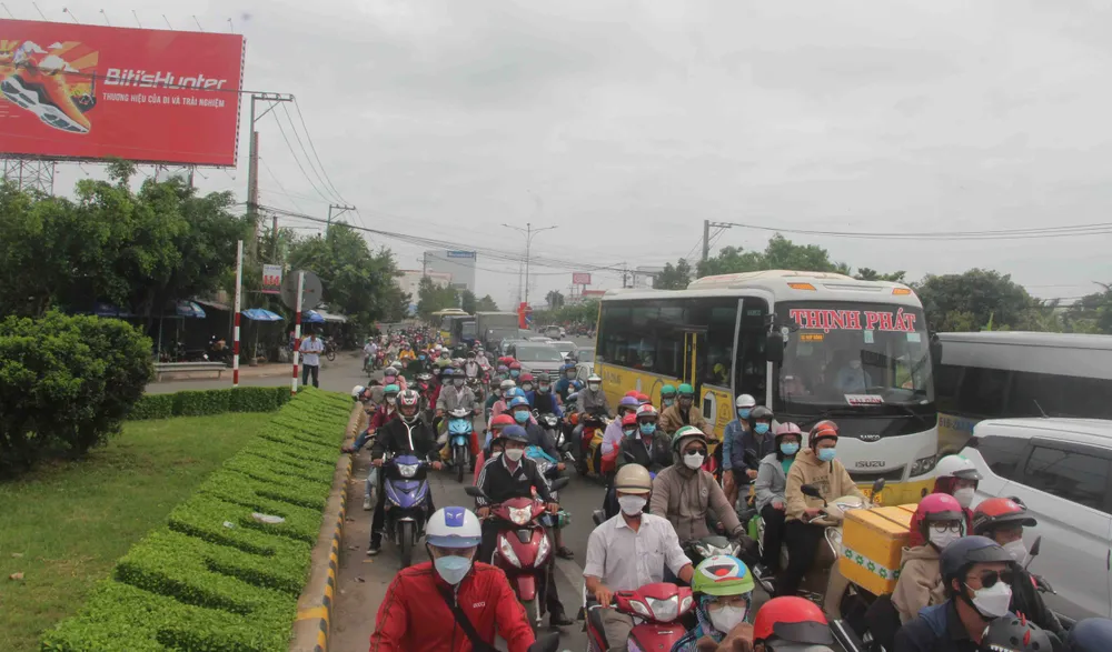 Khoảng 5 giờ 30 phút sáng 30-4, lưu lượng phương tiện tập trung nhiều từ hướng Tiền Giang đi Bến Tre dẫn đến tình trạng ùn tắc kéo dài trên Quốc lộ 60 qua khỏi khu vực siêu thị GO (TP Bến Tre, tỉnh Bến Tre).