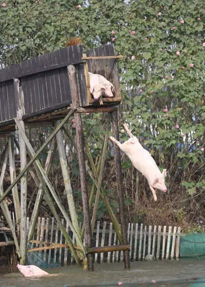Theo cách của ông Huang, đàn heo hàng chục con được lùa lên chiếc cầu cao 3m so với mặt nước rồi đẩy chúng xuống hồ. Huang giải thích rằng, việc cho heo bay và sau đó tự chúng phải bơi vào bờ nhằm tăng cường hệ miễn dịch chống lại bệnh tật cho chúng, giúp đàn heo ăn nhiều và mau lớn hơn.