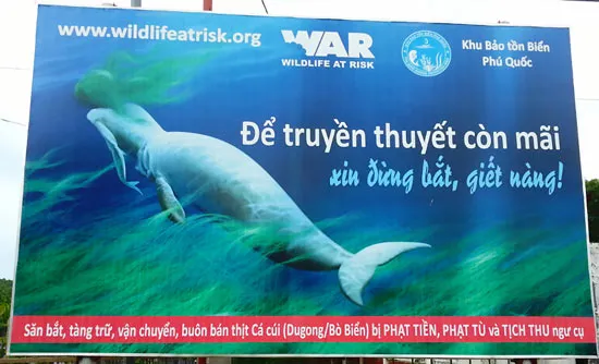 Bảng tuyên truyền bảo vệ dugong được Tổ chức Bảo vệ động vật hoang dã và Ban quản lý Khu bảo tồn biển Phú Quốc dựng ở nhiều tuyến đường trên đảo.