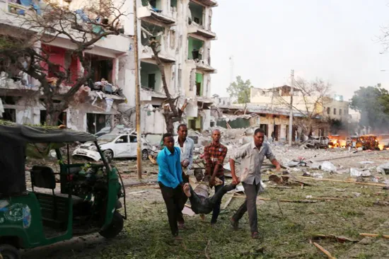 Cấp cứu người bị thương trong vụ tấn công khách sạn Ambassador ở thủ đô Mogadishu, Somalia, ngày 1-6-2016. Ảnh: REUTERS