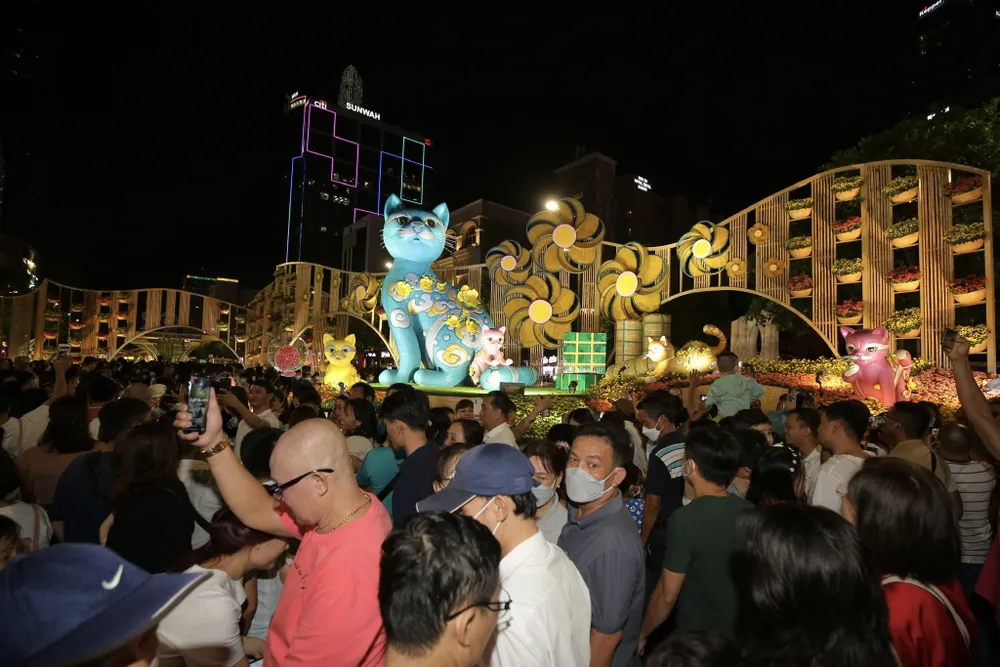 Đặc biệt, trải dọc trên 600m, 36 linh vật mèo tại đường hoa được tạo hình cách điệu, thể hiện đa dạng về kích thước, chất liệu, từ mút xốp, sắt, sơn mỹ thuật, phủ mùn cưa, giả đất nung đến ốp hoa tươi... được sơn nhiều lớp để giữ độ bền màu, bên ngoài sơn nhũ ca may tạo độ lấp lánh, rực rỡ, thể hiện nhiều sắc thái, biểu cảm khác nhau từ dễ thương, nghiêm túc, tinh nghịch, lười biếng, tò mò, thong thả…