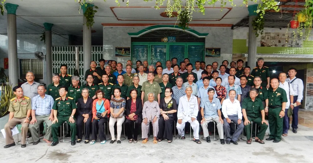 Các cựu chiến binh, thân nhân gia đình liệt sĩ trong trận chi khu Ba Càng chụp ảnh làm kỷ niệm