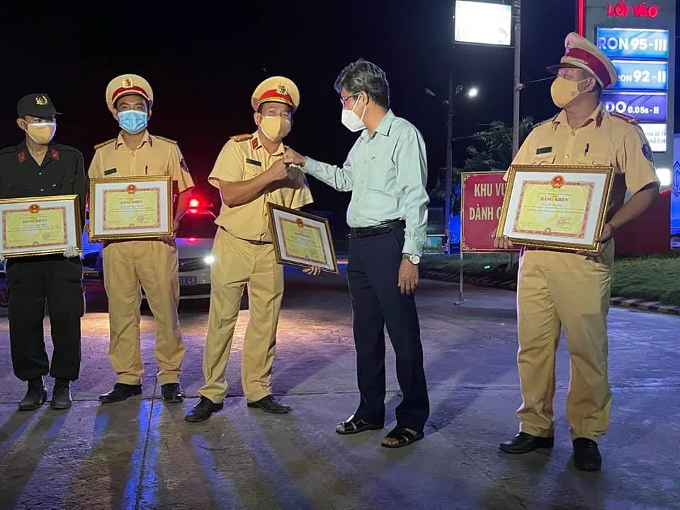 Ngày 14-9, UBND tỉnh Bình Thuận cho biết, khuya 13-9, ông Nguyễn Minh, Phó Chủ tịch UBND tỉnh đã có mặt tại Trạm CSGT Hàm Tân (Phòng CSGT - Công an tỉnh Bình Thuận) để trao tặng bằng khen của Chủ tịch UBND tỉnh cho tập thể, cá nhân có thành tích phát hiện kịp thời sự việc xe tải chở 15 người trong thùng xe đông lạnh để vượt chốt kiểm dịch về quê.