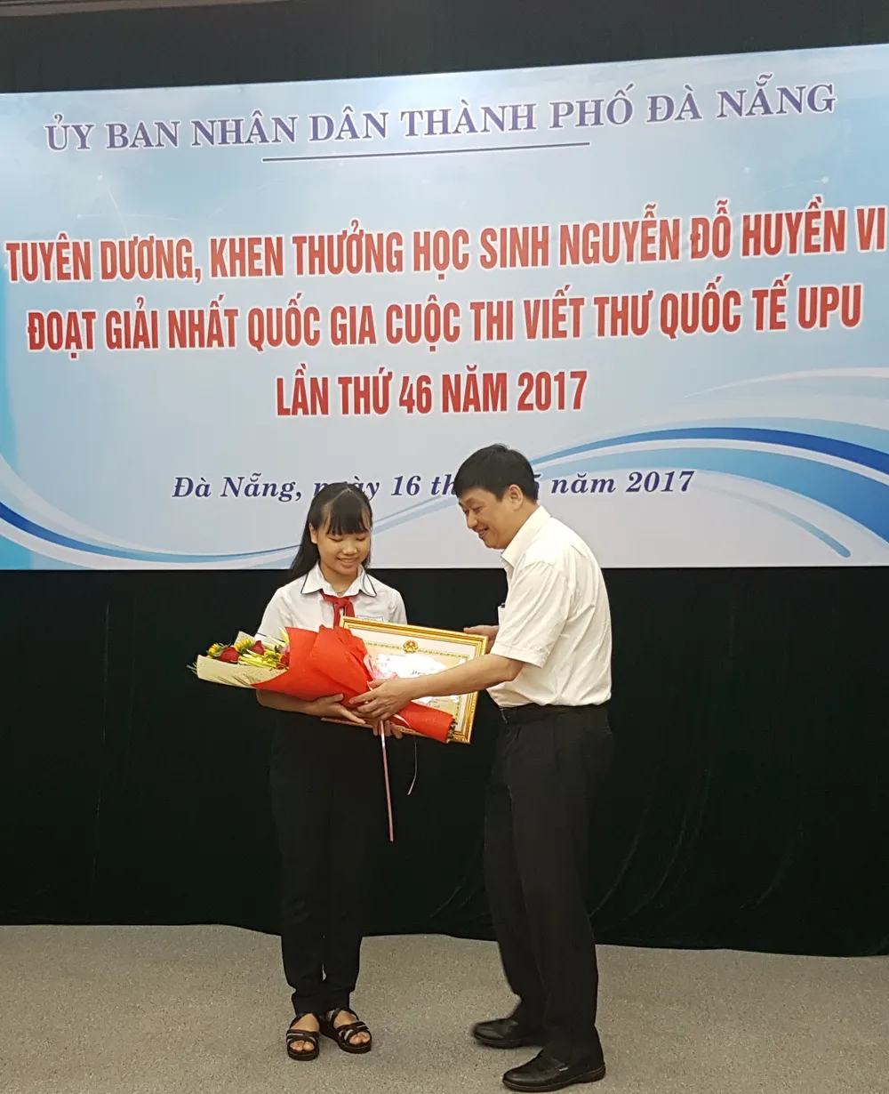 Thay mặt lãnh đạo TP Đà Nẵng, ông Đặng Việt Dũng, Trưởng ban Tuyên giáo Thành ủy kiêm Phó Chủ tịch UBND TP Đà Nẵng đã tặng bằng khen và tiền thưởng 2 triệu đồng cho em Nguyễn Đỗ Huyền Vi vì thành tích nêu trên.