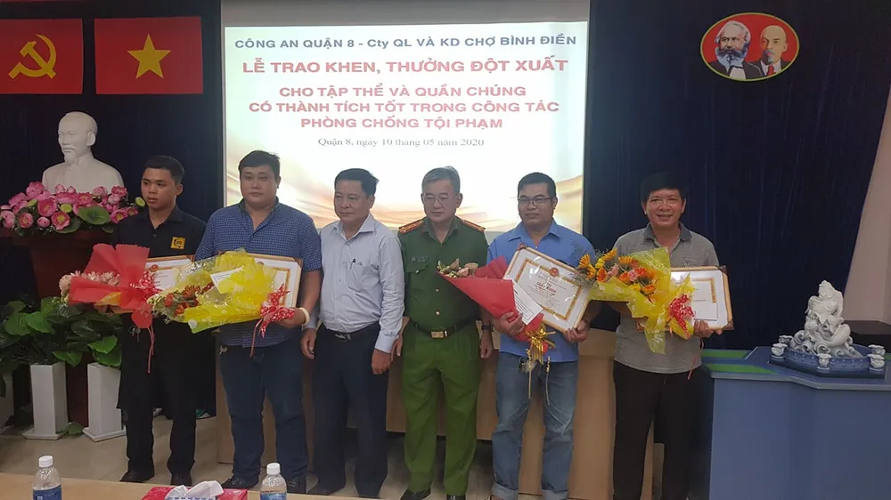 Bên cạnh đó, Công an quận 8 còn trao khen thưởng cho tập thể Phòng bảo vệ Công ty Quản lý và Kinh doanh chợ Bình Điền.
