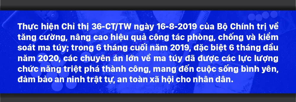 Thực hiện Chỉ thị 36-CT/TW ngày 16-8-2019 của Bộ Chính trị về tăng cường, nâng cao hiệu quả công tác phòng, chống và kiểm soát ma túy; trong 6 tháng cuối năm 2019, đặc biệt 6 tháng đầu năm 2020, các chuyên án lớn về ma túy đã được các lực lượng chức năng triệt phá thành công, mang đến cuộc sống bình yên, đảm bảo an ninh trật tự, an toàn xã hội cho nhân dân.