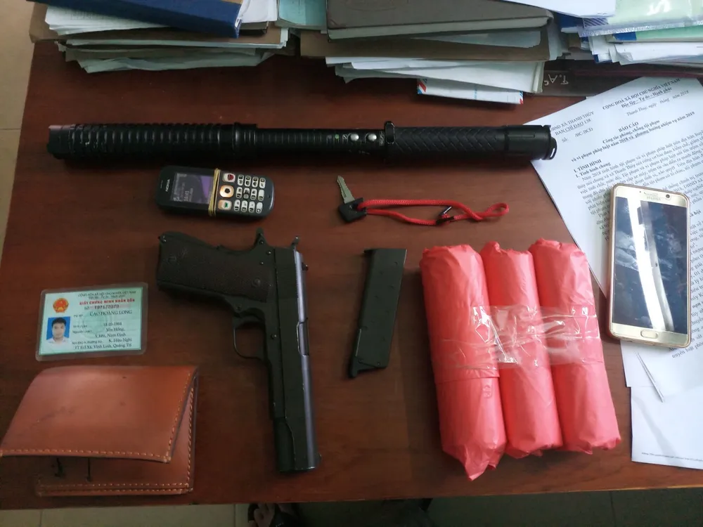 Tang vật thu giữ được tại hiện trường, gồm: 1 súng ngắn bắn đạn bi, 1 xe máy, 2 điện thoại và khẩu trang.