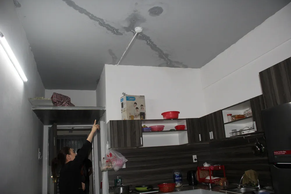 Nhận nhà được một năm, nhưng thực tế ở từ cuối năm 2019 (khoảng 4 tháng), gia đình chị gặp cảnh nước thấm dột nghiêm trọng khắp nơi. Chị Thu Thảo kể, mỗi lần trời mưa, nhẹ thì nước men theo trần nhỏ giọt dưới sàn, nặng hơn là lúc nước nhỏ ngay giữa nhà, ngay giường ngủ. Nước lênh láng trong phòng vệ sinh. Tình trạng kéo dài khiến đồ đạc tại các vị trí thấm dột mốc meo, hư hỏng.