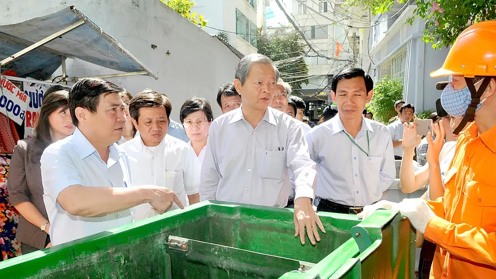 Chiều 30-6, Chủ tịch UBND TPHCM Nguyễn Thành Phong và Phó Chủ tịch UBND TPHCM Lê Văn Khoa cùng đại diện UBND một số quận, huyện, sở ngành của TPHCM đã có buổi khảo sát tình hình phân loại rác thải sinh hoạt tại nguồn trên địa bàn quận 1.