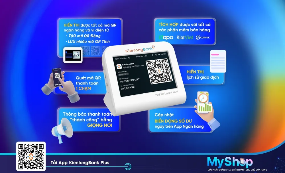 Đặc biệt, mới đây KienlongBank đã cho ra mắt giải pháp thanh toán không dùng tiền mặt hàng đầu Việt Nam, bao gồm thiết bị thanh toán Paybox sử dụng công nghệ IoT đi kèm Mini App MyShop trên ứng dụng KienlongBank Plus.