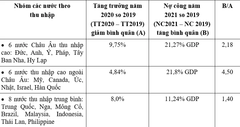 Qua BẢNG 1 ta thấy, để ứng phó với suy giảm tăng trưởng kinh tế năm 2020 so với 2019 bình quân là 9,75%, 6 nước thu nhập cao ở Châu Âu đã tăng nợ công năm 2021 so với 2019 bình quân là 21,27% GDP. Tức là để khắc phục hậu quả của suy giảm kinh tế 1%, bình quân họ phải tăng nợ công thêm 2,18% GDP (B/A BẢNG 1).