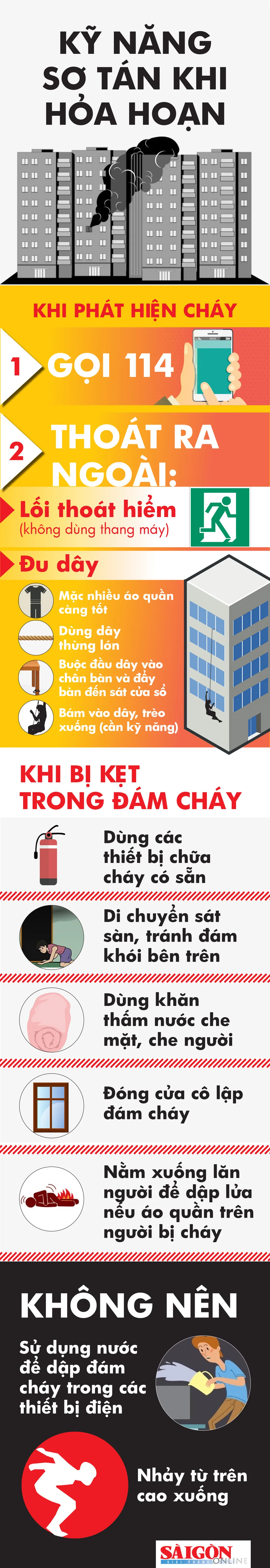 Trong trường hợp xảy ra cháy, hoảng loạn là một trong những nguyên nhân hàng đầu khiến khả năng tử vong cao hơn, bởi sự thiếu tỉnh táo dễ khiến người ta có những hành động không phù hợp trong hoàn cảnh nguy hiểm. Bên dưới đây là các kỹ năng sơ tán khi có hỏa hoạn.