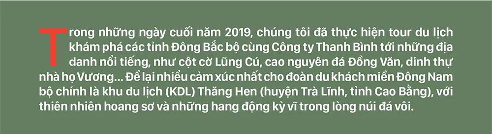 Trong những ngày cuối năm 2019, chúng tôi đã thực hiện tour du lịch khám phá các tỉnh Đông Bắc bộ cùng Công ty Thanh Bình tới những địa danh nổi tiếng, như cột cờ Lũng Cú, cao nguyên đá Đồng Văn, dinh thự nhà họ Vương… Để lại nhiểu cảm xúc nhất cho đoàn du khách miền Đông Nam bộ chính là khu du lịch (KDL) Thăng Hen (huyện Trà Lĩnh, tỉnh Cao Bằng), với thiên nhiên hoang sơ và những hang động kỳ vĩ trong lòng núi đá vôi.