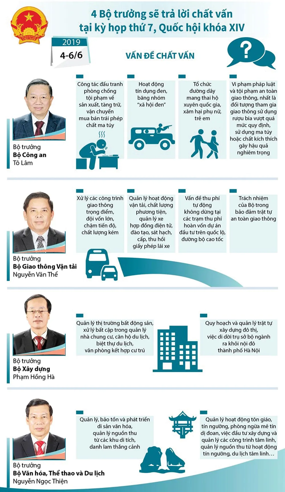 Bắt đầu từ hôm nay 4-6, phiên chất vấn và trả lời chất vấn tại kỳ họp Quốc hội sẽ diễn ra và kéo dài đến 6-6. Phó Thủ tướng Phạm Bình Minh, bộ trưởng các bộ: Công an, Xây dựng, Giao thông Vận tải (GTVT), Văn hóa - Thể thao và Du lịch sẽ đăng đàn.