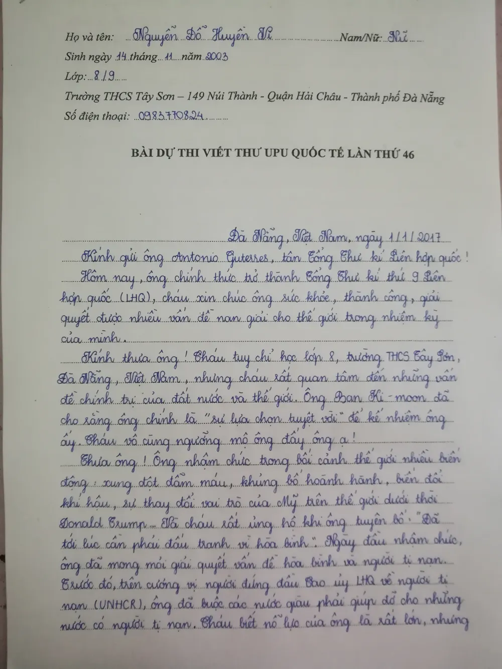 Bức thư của em Nguyễn Đỗ Huyền Vi gửi Tổng thư ký Liên hợp quốc