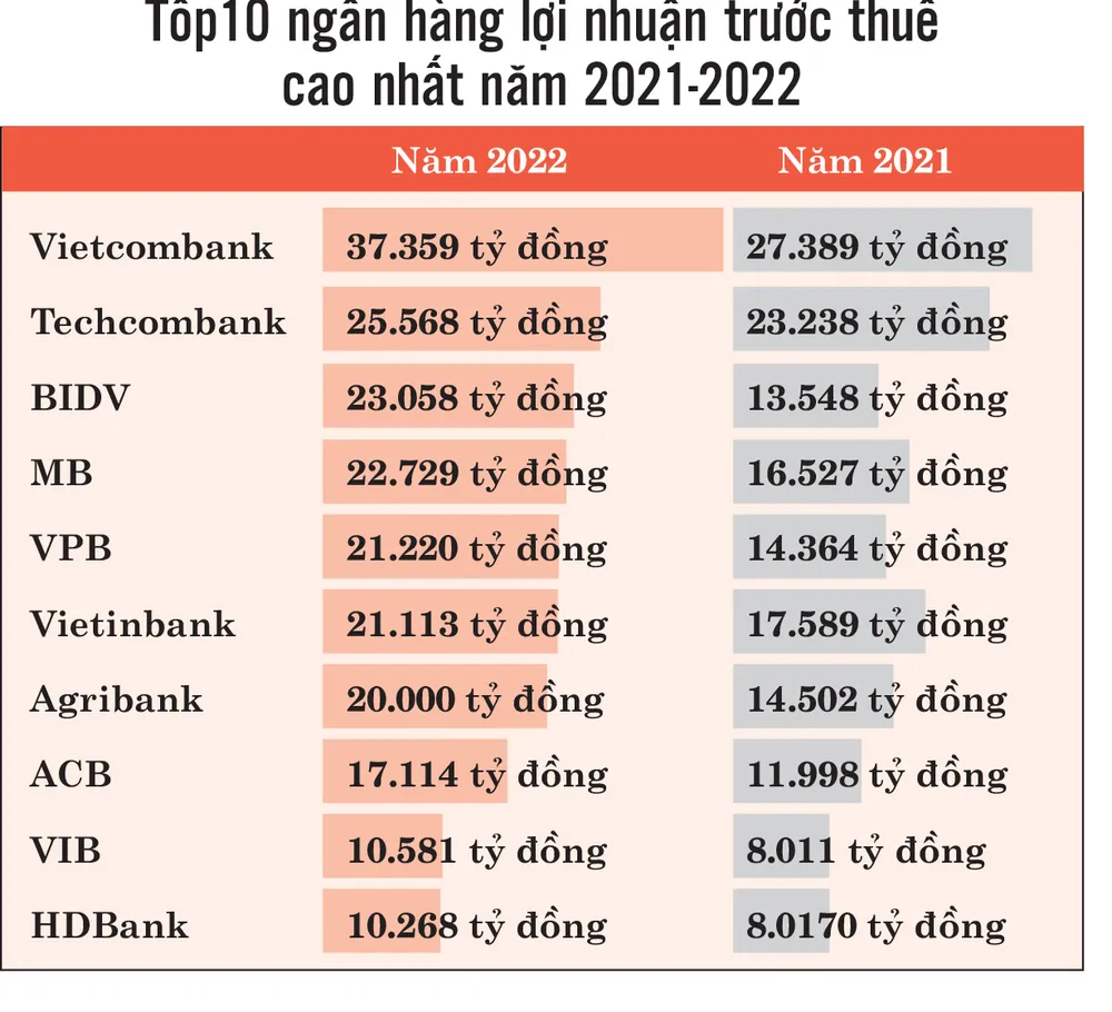 Từ báo cáo tài chính của 26 ngân hàng thương mại (NHTM) niêm yết trên sàn chứng khoán và Agribank (NHTM 100% vốn nhà nước chưa lên sàn) cho thấy, lợi nhuận ngành ngân hàng năm 2022 đạt khoảng 265.000 tỷ đồng (11,5 tỷ USD), tăng gần 34% so với năm trước. Trong đó, 22 NHTM có kết quả kinh doanh tăng trưởng so với năm trước và phần lớn đạt mức cao nhất từ trước đến nay. Trong số này, có 7 NHTM đạt mức lợi nhuận trên 20.000 tỷ đồng gồm Vietcombank, Techcombank, BIDV, MB, VPBank, Agribank và VietinBank.