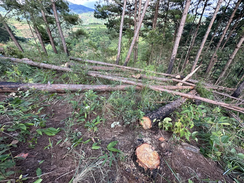 Tại hiện trường, những cây thông vừa bị cưa hạ lá còn xanh, nhựa cây vẫn đang chảy, thân cây nằm xếp lớp chưa kịp dọn khỏi khu rừng.