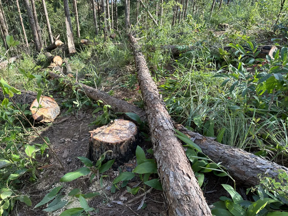 Thông ba lá gần 30 năm tuổi bị cưa hạ nằm la liệt. Ảnh: ĐOÀN KIÊN |